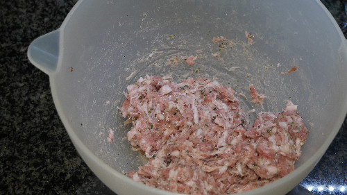 Place the sausage meat in a small mixing bowl and add the salt, pepper, and herbs. When the onions have been in the pan for 5 minutes and have softened up a little bit, add them to the mixing bowl as well. Mix the sausage meat and the other contents of the bowl with your hands, just so they are combined.